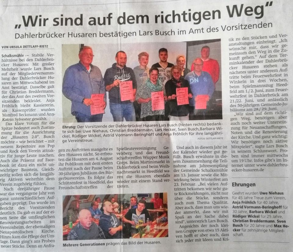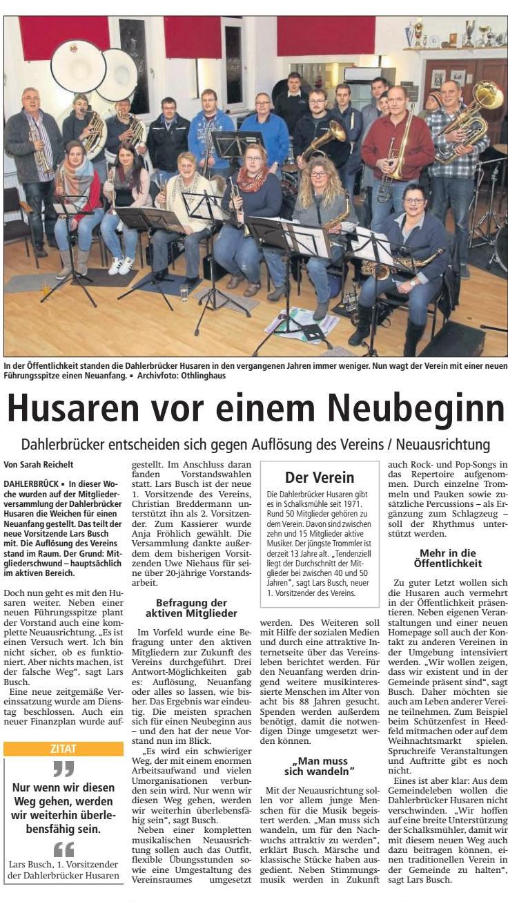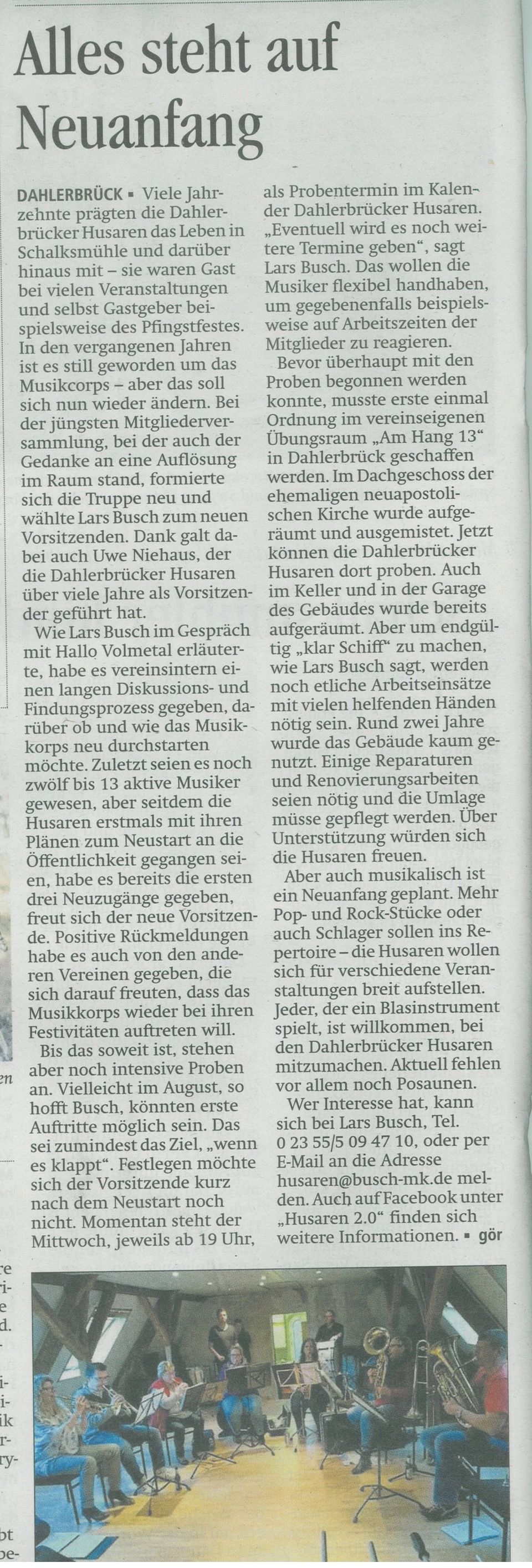 Bis zu dieser Entscheidung waren fast drei Jahre vergangen, in denen die Husaren ihre musikalischen Tätigkeiten sowie auch diverse Teilnahmen an dem Gemeindeleben eingestellt hatten. Ein paar Musiker aus dem alten Stamm der Musikgruppe haben sich vorgenommen, mit einem Neustart die Husaren wieder in ein aktives Vereinsleben zu bringen. Neben der Kassiererin Anja Fröhlich und dem neuen zweiten Vorsitzenden Christian Breddermann unterstützt der neue Vorsitzende Lars Busch diesen Weg.