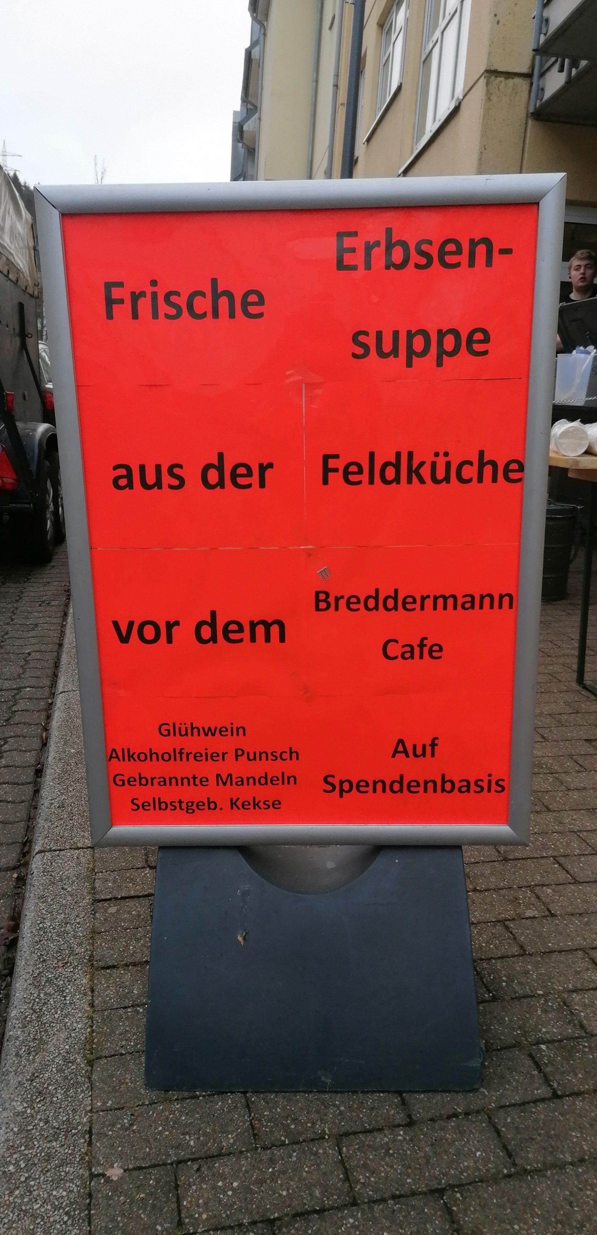 An dem Breddermann Cafe in der Bahnhofstraße, wird die Feldküche nicht zu übersehen sein. Dazu gibt es den leckeren Glühwein aus dem Cafe und einen alkoholfreien Früchtepunsch. Das alles geben wir Husaren gegen eine Spende ab und hoffen, das viele Schalksmühle diese Aktion unterstützen, damit wir Husaren auch in Zukunft, als Taditionsverein zum Gemeinsamen beitragen können.